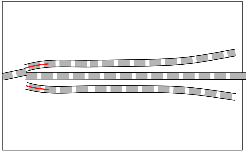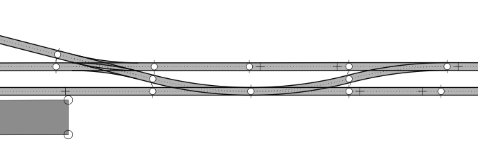 Als hier een trein vertrekt vanaf het onderste spoor, kan de trein nooit meer op het onderste spoor terugkomen zonder te steken. De oplossing is simpel en bestaat uit het toevoegen van twee overloop wissels zodat een terugkerende trein ook naar het onderste spoor kan. Als je dus een baanplaan ontwerpt, let dan goed of de treinen overal kunnen komen.