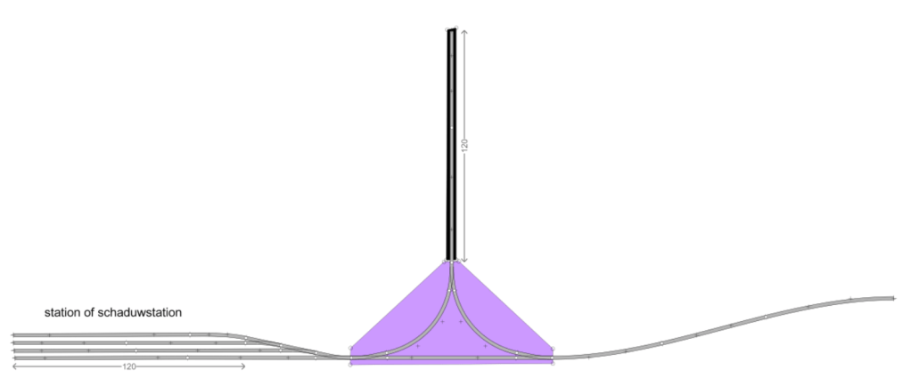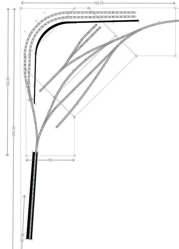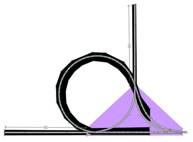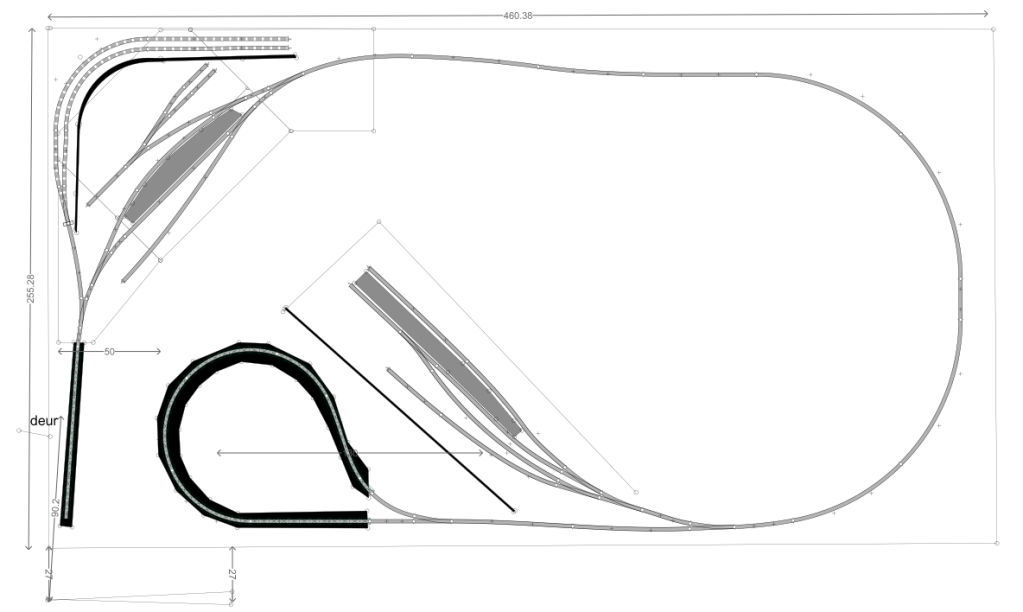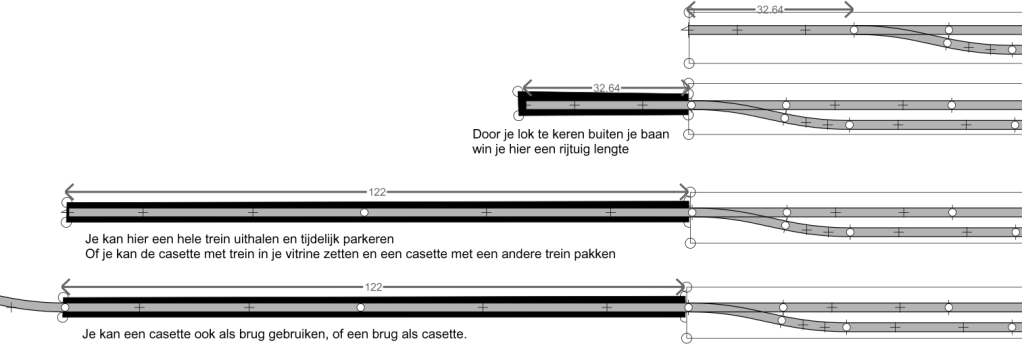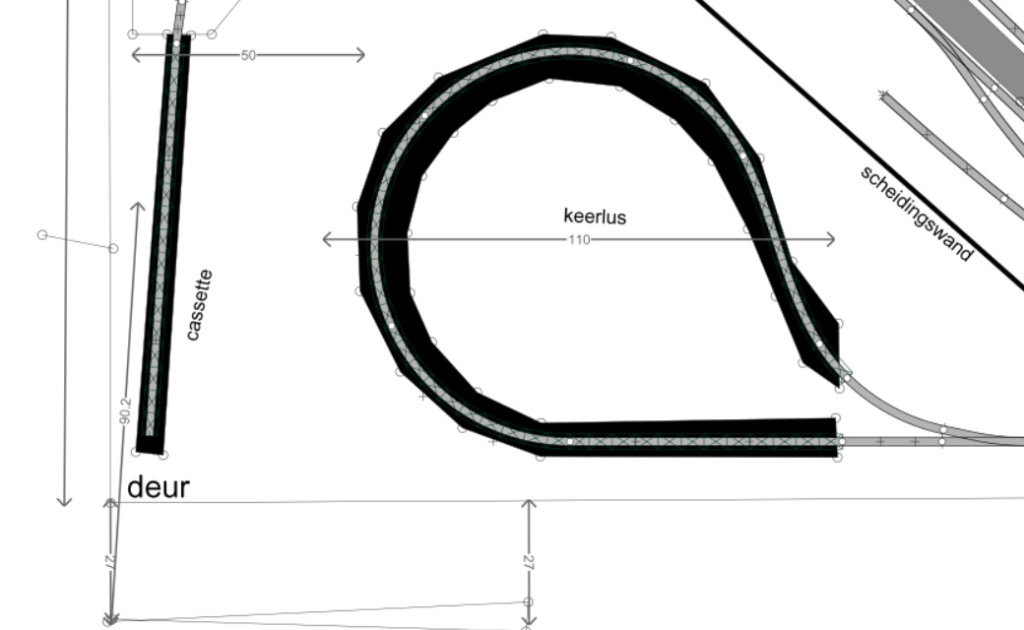 De keerlus onderin is nu zo gepland dat deze 90 graden naar beneden of omhoog kan klappen. Als je dus even wilt rijden, klap je even de lus om hoog en je kan aan de slag. Het is natuurlijk zo wel lastig om eventueel je csasettes te wisselen. Maar het gaat hier om het idee dat je dus een keerlus kan plaatsen op een stuk dode ruimte wat je anders niet zou gebruiken. Deze lus is ongeveer van links tot aan het einde van de wissel 140cm. De zwarte lijnen geven aan welk gedeelte er om laag zou klappen.