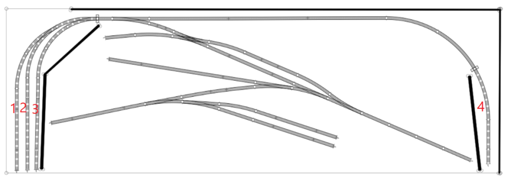 Het is misschien niet bepaald mooi maar ga maar na hoe de treinen kunnen rijden. Ze kunnen rondjes rijden op de binnenbaan, op de buitenbaan en ze kunnen rondjes rijden op de bovenste twee sporen of op de onderste twee sporen.