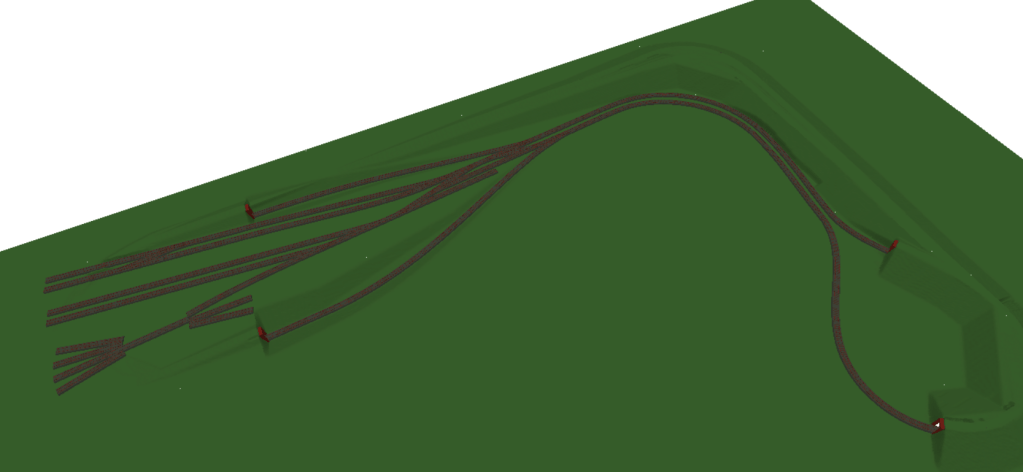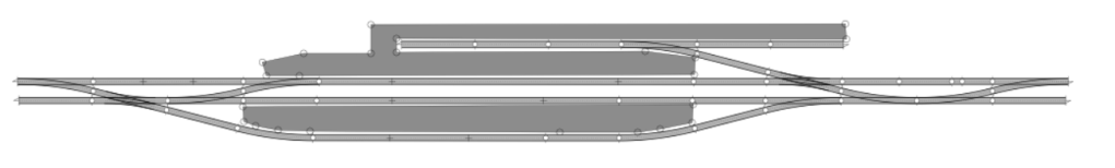 Wat je hier ook kan doen, is om een derde spoor te maken voor het pendeltraject wat omhoog loopt aan de buitenzijde. Dit is misschien wel een beetje afhankelijk van welke scenery setting de baan heeft. In Nederland bijvoorbeeld zal je het bovenstaand voorbeeld niet zo snel tegen komen. Maar het is niet ondenkbaar natuurlijk. Een klein bijkomstig voordeel is dat de wisselstraat voor de lus simpeler wordt omdat het station daar dan verdwijnt.