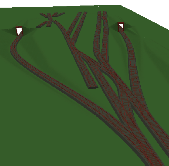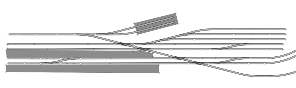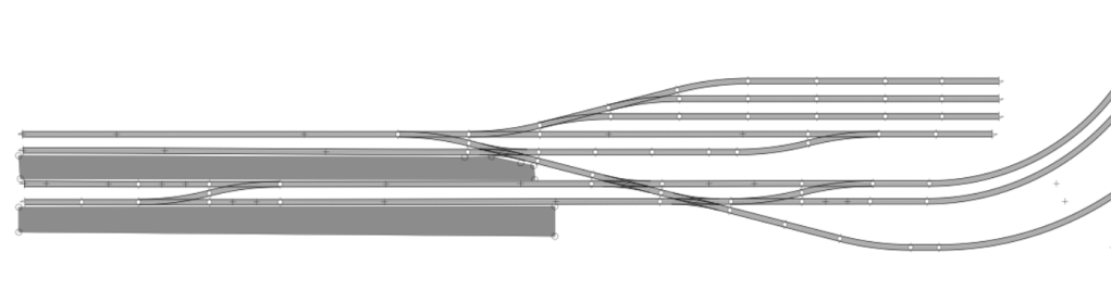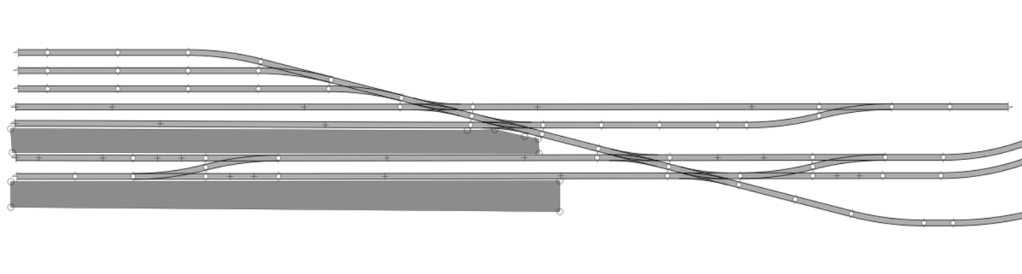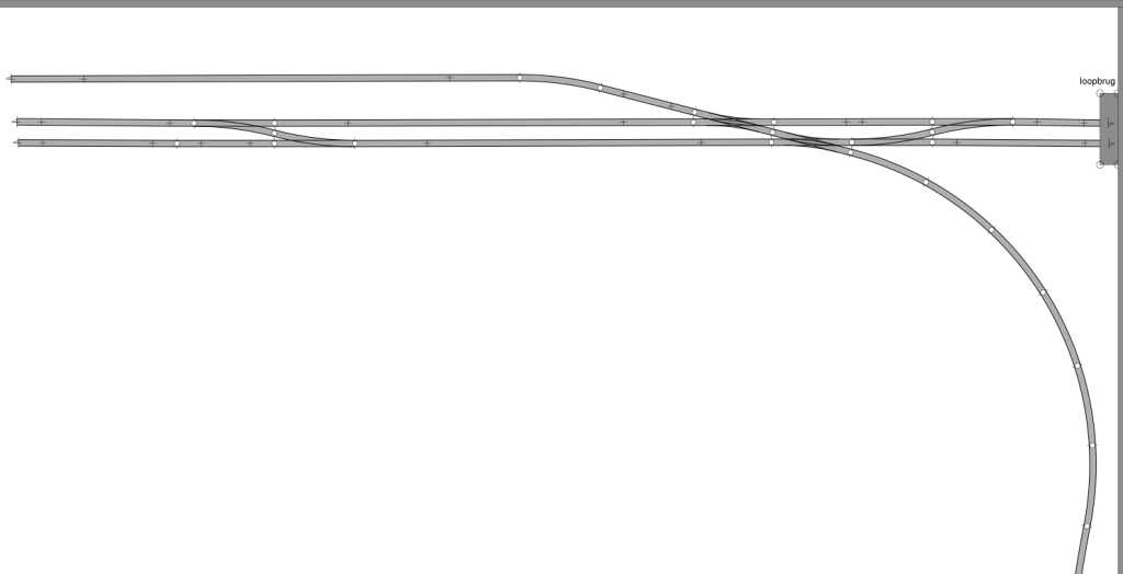 In dit voorbeeld heb ik precies dat gedaan. Rechts lopen twee hoofdsporen, die gaan onder de loopbrug door en dan… stoppen ze te bestaan.. De branchlijn daarentegen gaat verder de kamer in naar een ‘betekenisvolle’ plaats.