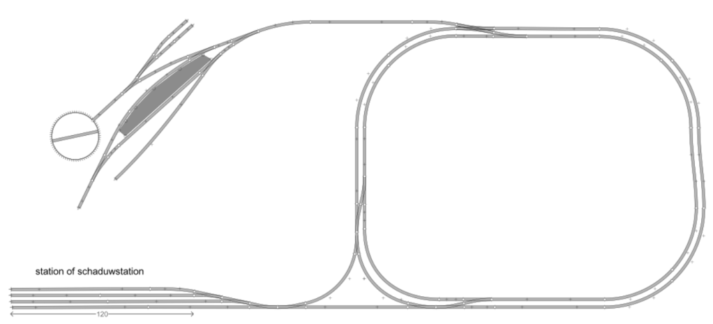 Nu is een treinenloop voor een rondrijbaan niet zo ingewikkeld om te bedenken, daarom leg ik de focus hier vooral op stations en op schaduwstations. Neem dit simpele station