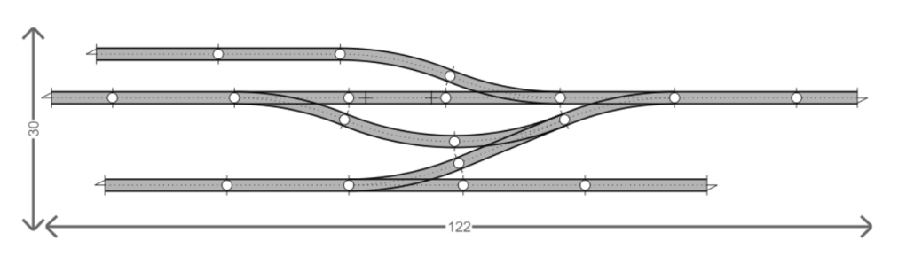Je zal onderhand wel doorhebben, voor elke wissel die hier bij komt, kan je twee treinen meer kwijt mits je ze achter elkaar laat rijden op deze wijze.