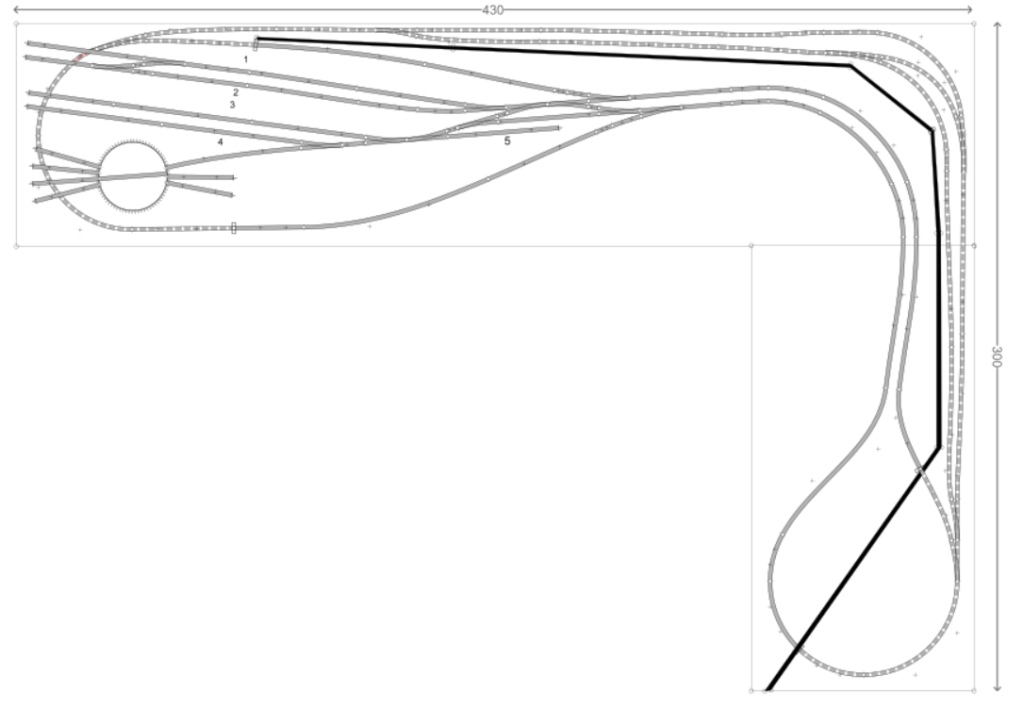 Het volgende L-vormige baanplan biedt genoeg mogelijkheden voor een goede treinloop. Treinen kunnen rond rijden, er is een schaduwstation in verwerkt, de krappe lussen zijn grotendeels verborgen en er is een station compleet met draaischijf