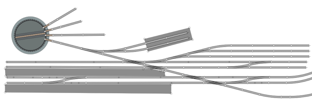 Links is hier een grote segment draaischijf gemaakt waarop tot drie treinen weggezet kunnen worden.