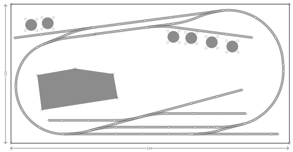 Toelichting: Ik merk dat beginners erg snel richting een rechthoek vormige baan neigen. Nu kan je op een plaat 2,44m x 1,22m in H0 wel wat leuks uitleggen, maar het is doorgaans wel zo dat een rechthoek niet de meest ideale vorm is voor een treinbaan.