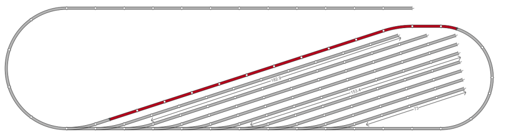 Als je nu ook voor getrokken treinen ook nog wilt kunnen omlopen, dan kan je er nog eens 2x ~1,50m van af trekken. Je hebt voor een pendelbaan met omloopmogelijkheden aan beide zijdes best veel lengte nodig. Je krijgt ook een interessantere actie tijd, want omlopen, is leuk en kost ook tijd. En je hebt een soort verplichte pauze voordat je terug rijdt.